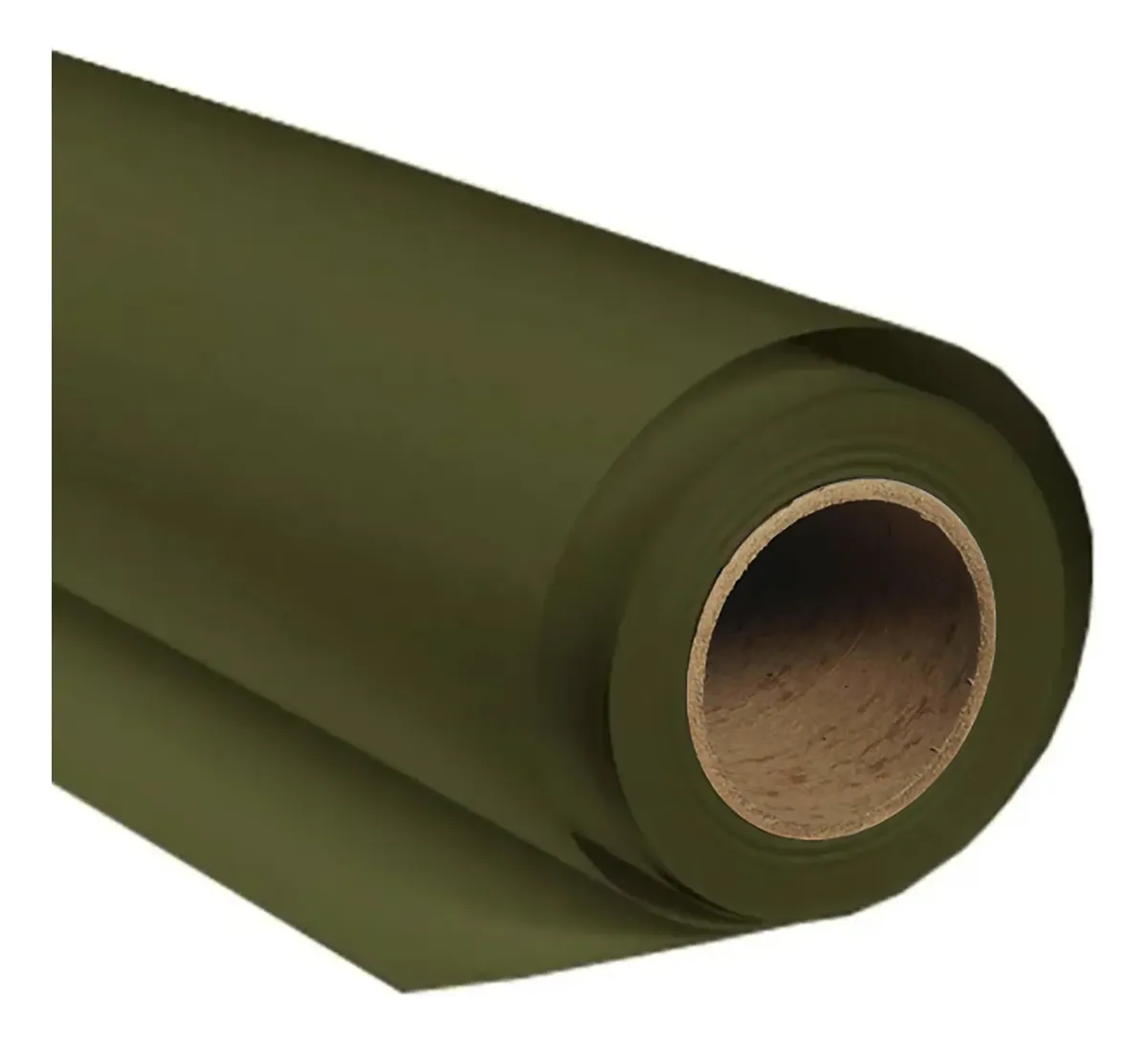Fundo fotográfico em papel na cor verde oliva, ideal para composições mais sóbrias, elegantes ou com aquela vibe meio “militar/industrial” que muita gente acha sofisticada.