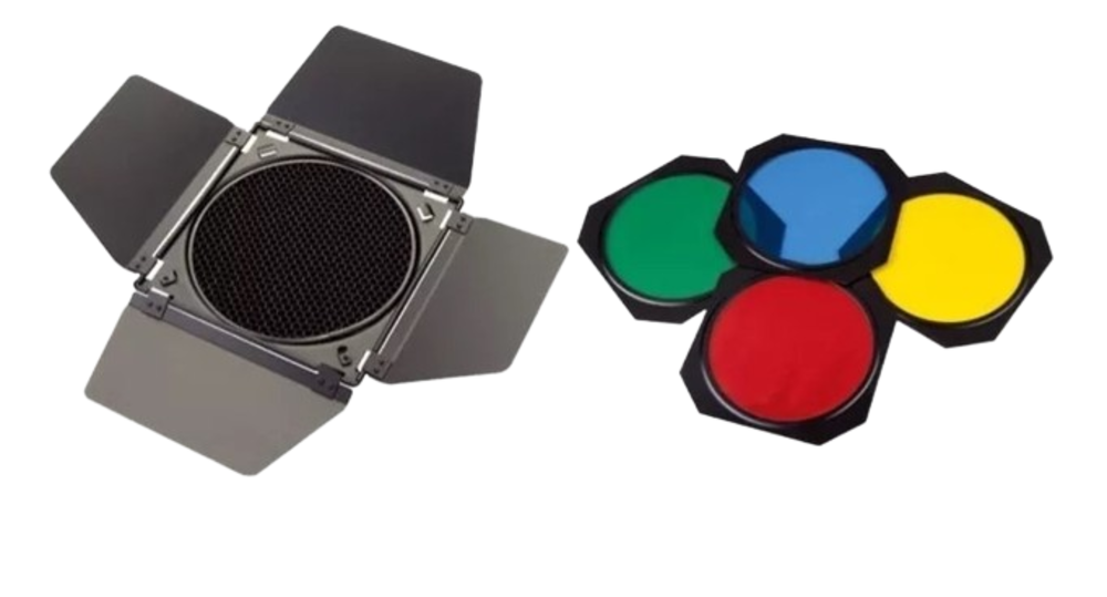 O kit barndoor universal vem com uma grade colmeia e 4 filtros coloridos de gel. Os filtros coloridos alteram a forma, a quantidade e a cor da saída do flash. A abertura dos rebatedores pode ajustar seu feixe de luz de estreito para largo, dando a você maior controle sobre sua luz de incidência.